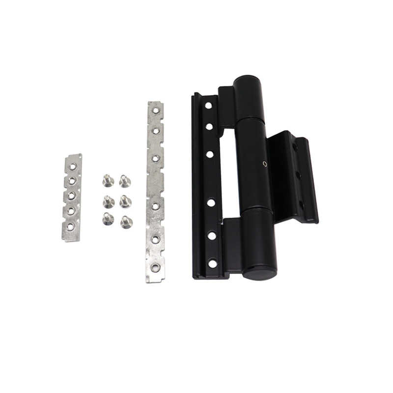 The hinge is black and has a regular shape with multiple holes for connecting to doors, windows, and other objects. It comes with a metal connector and screws. The metal connector is a long strip with holes, and the screws are used to firmly assemble the components. The entire product provides flexible opening and closing of doors, windows, and other objects, as well as a stable connection.