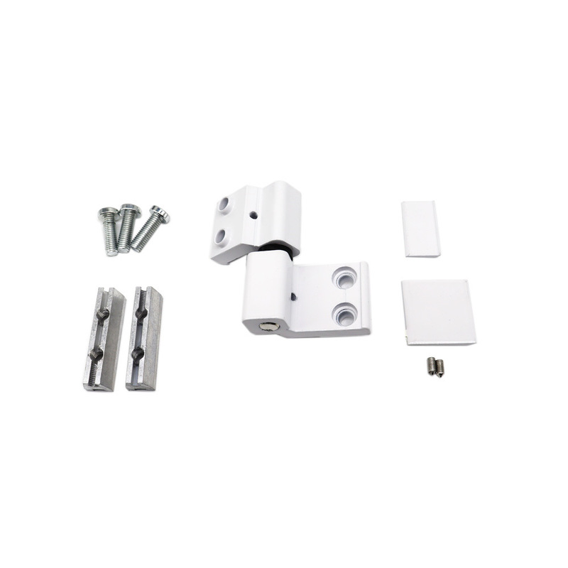 Structure and Accessories: The hinge features a segmented hinge structure with metal connectors, multiple sets of screws, and white plastic washers. Installation is simple and adaptable to the structure of thermally-insulated aluminum doors and windows.