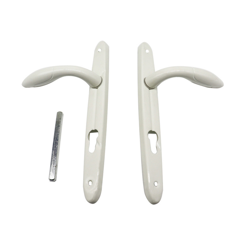 A pair of door lock handles: Featuring a white coating, these handles are curved and paired with a long, narrow lock body panel. The panel includes a lock cylinder hole for installing the lock cylinder, enabling the door to lock. The overall style is simple and practical, suitable for interior doors or entrance doors.